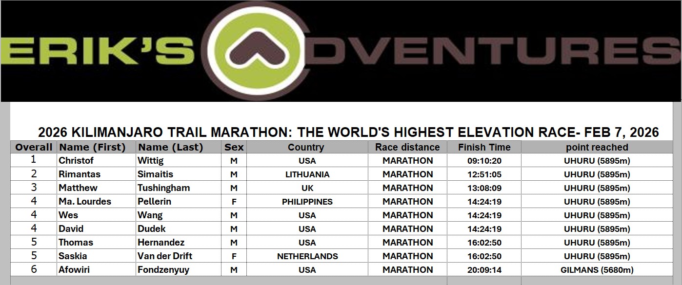 The 2026 Kilimanjaro Trail Marathon Race is in the books. We had nearly a 100% success rate on getting to the summit. Great job everyone completing the world’s highest elevation marathon! Results are below. Thanks to everyone who came this year. You are all amazing people to have accomplished this race!